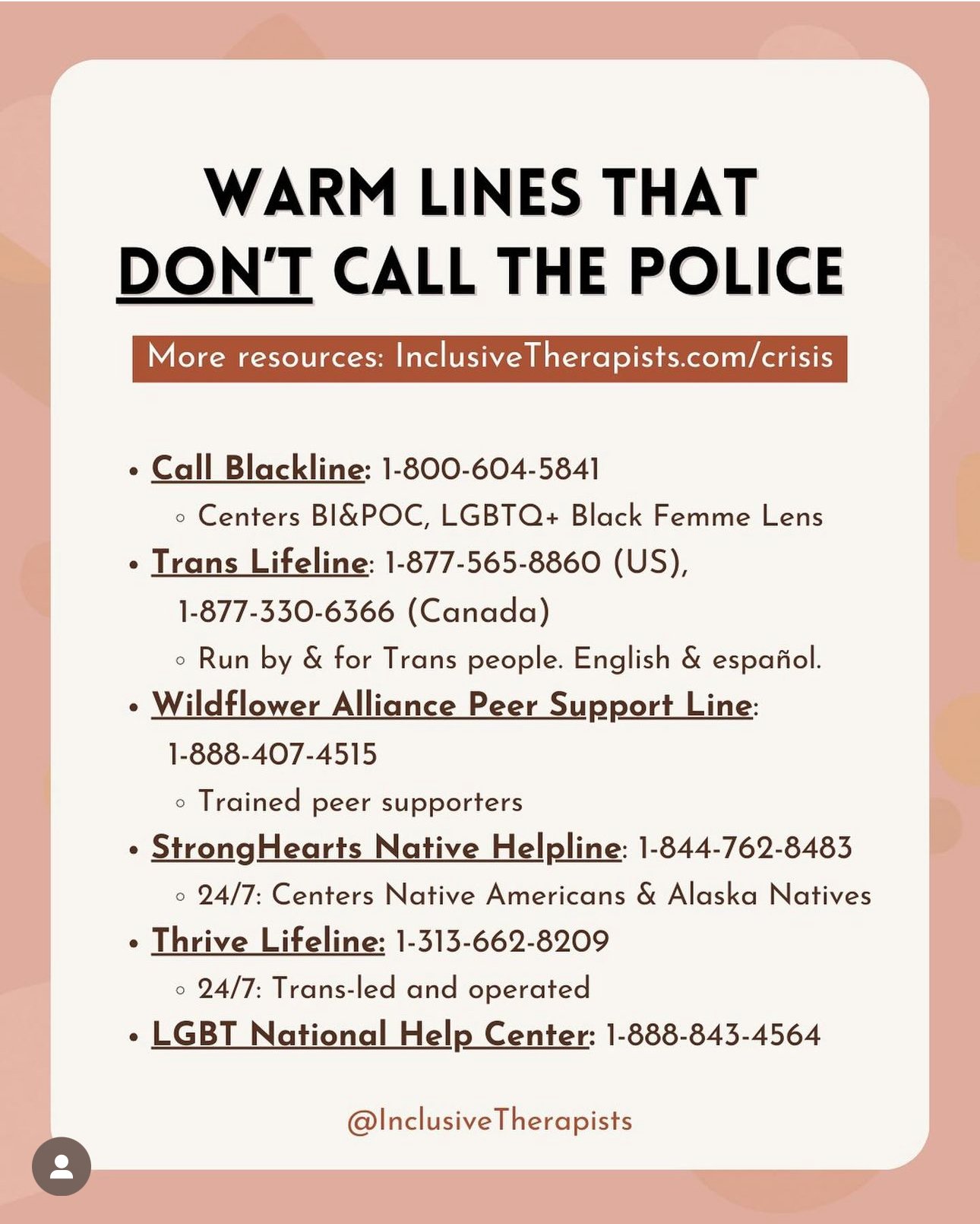 *WARMLINE - if not in crisis but need to talk: https://warmline.org/